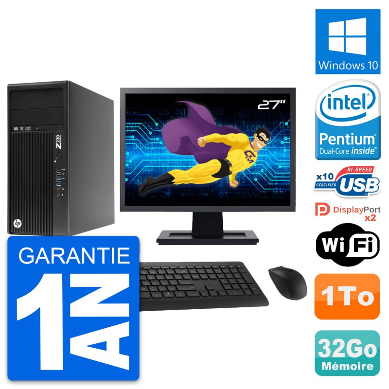 PC Tour HP WorkStation Z230 - Intel Pentium Dual-Core G3220 3.0 Ghz (3 Mo) - 32 Go DDR3 - Disque Dur 3,5" 1 To - Graveur DVD - Clef Wifi USB - Windows 10 - Livré avec Ecran 27" + clavier + souris (Marques et modèles variables) - Garantie 1 an.