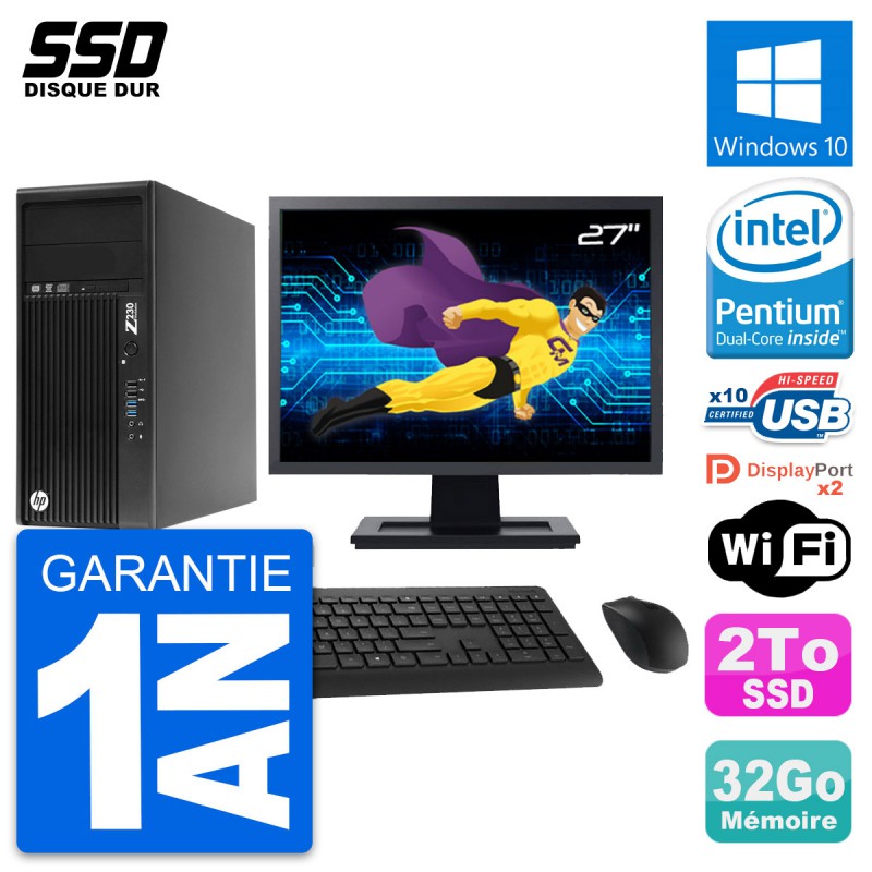 PC Tour HP WorkStation Z230 - Intel Pentium Dual-Core G3220 3.0 Ghz (3 Mo) - 32 Go DDR3 - SSD 2 To - Graveur DVD - Clef Wifi USB - Windows 10 - Livré avec Ecran 27" + clavier + souris (Marques et modèles variables) - Garantie 1 an.