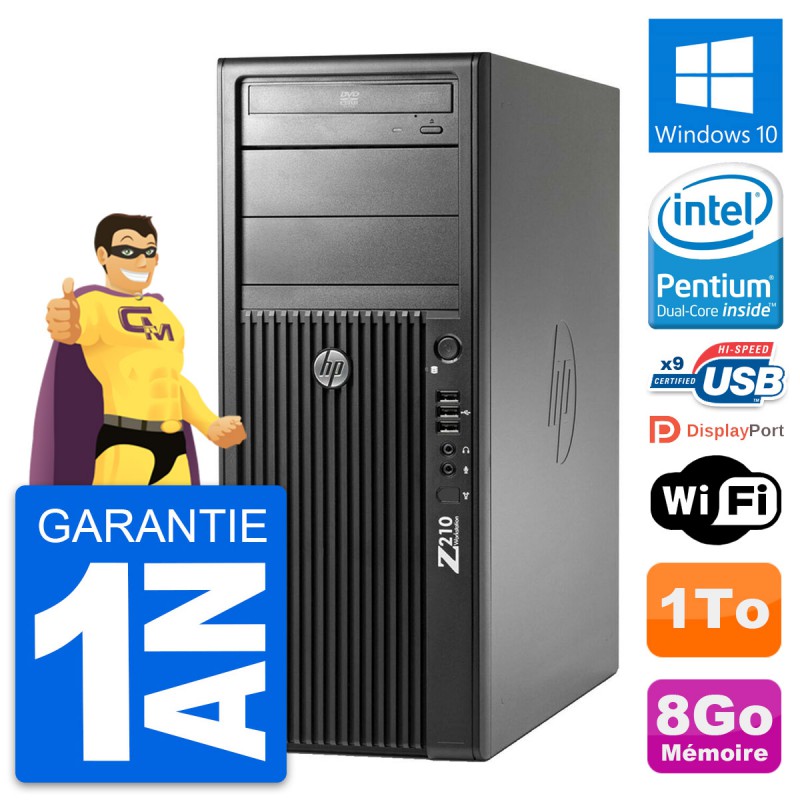 PC Tour HP WorkStation Z210 - Intel Pentium Dual-Core G630 2.7 Ghz (3 Mo) - 8 Go DDR3 - Disque Dur 3,5" 1 To - Graveur DVD - Clef Wifi USB - Windows 10 - Garantie 1 an.