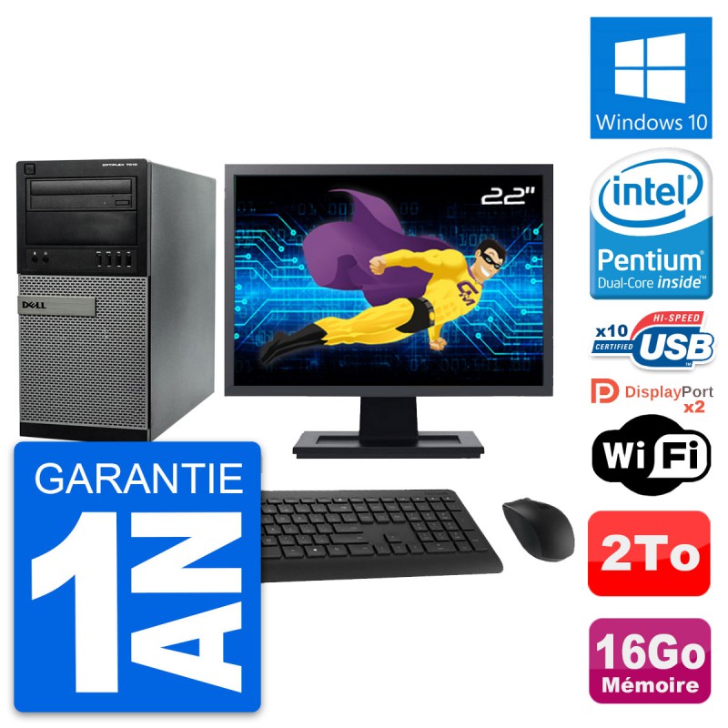 PC Dell 7010 MT - Intel Pentium Dual-Core G2020 2.9 Ghz (3 Mo) - 16 Go DDR3 - Disque Dur 3,5" 2 To - Graveur DVD - Clef Wifi USB - Windows 10 - Livré avec Ecran 22" + clavier + souris (Marques et modèles variables) - Garantie 1 an.