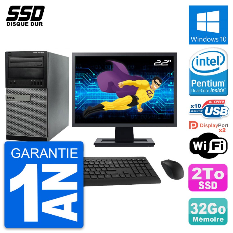 PC Dell 7010 MT - Intel Pentium Dual-Core G2020 2.9 Ghz (3 Mo) - 32 Go DDR3 - SSD 2 To - Graveur DVD - Clef Wifi USB - Windows 10 - Livré avec Ecran 22" + clavier + souris (Marques et modèles variables) - Garantie 1 an.