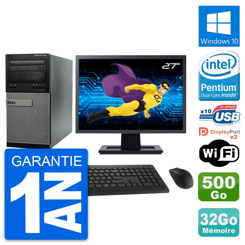 PC Dell 7010 MT - Intel Pentium Dual-Core G2020 2.9 Ghz (3 Mo) - 32 Go DDR3 - Disque Dur 3,5" 500 Go - Graveur DVD - Clef Wifi USB - Windows 10 - Livré avec Ecran 27" + clavier + souris (Marques et modèles variables) - Garantie 1 an.