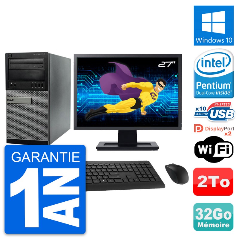 PC Dell 7010 MT - Intel Pentium Dual-Core G2020 2.9 Ghz (3 Mo) - 32 Go DDR3 - Disque Dur 3,5" 2 To - Graveur DVD - Clef Wifi USB - Windows 10 - Livré avec Ecran 27" + clavier + souris (Marques et modèles variables) - Garantie 1 an.