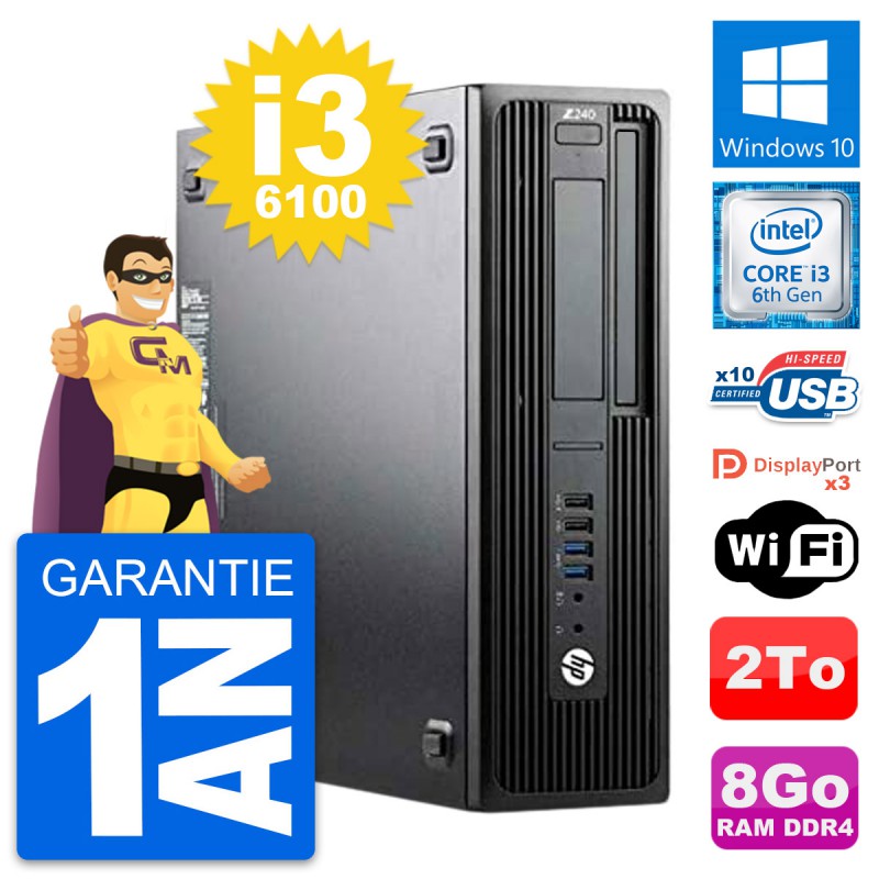 PC HP WorkStation Z240 SFF - Intel Core i3-6100 3.7 Ghz (3 Mo) - 8 Go DDR4 - Disque Dur 3,5" 2 To - Clef Wifi USB - Windows 10 - Garantie 1 an.