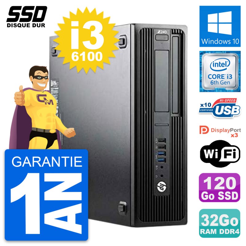PC HP WorkStation Z240 SFF - Intel Core i3-6100 3.7 Ghz (3 Mo) - 32 Go DDR4 - SSD 120 Go - Clef Wifi USB - Windows 10 - Garantie 1 an.