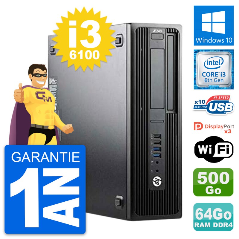 PC HP WorkStation Z240 SFF - Intel Core i3-6100 3.7 Ghz (3 Mo) - 64 Go DDR4 - Disque Dur 3,5" 500 Go - Clef Wifi USB - Windows 10 - Garantie 1 an.