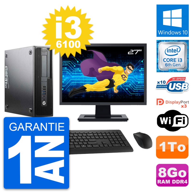 PC HP WorkStation Z240 SFF - Intel Core i3-6100 3.7 Ghz (3 Mo) - 8 Go DDR4 - Disque Dur 3,5" 1 To - Clef Wifi USB - Windows 10 - Livré avec Ecran 27" + clavier + souris (Marques et modèles variables) - Garantie 1 an.
