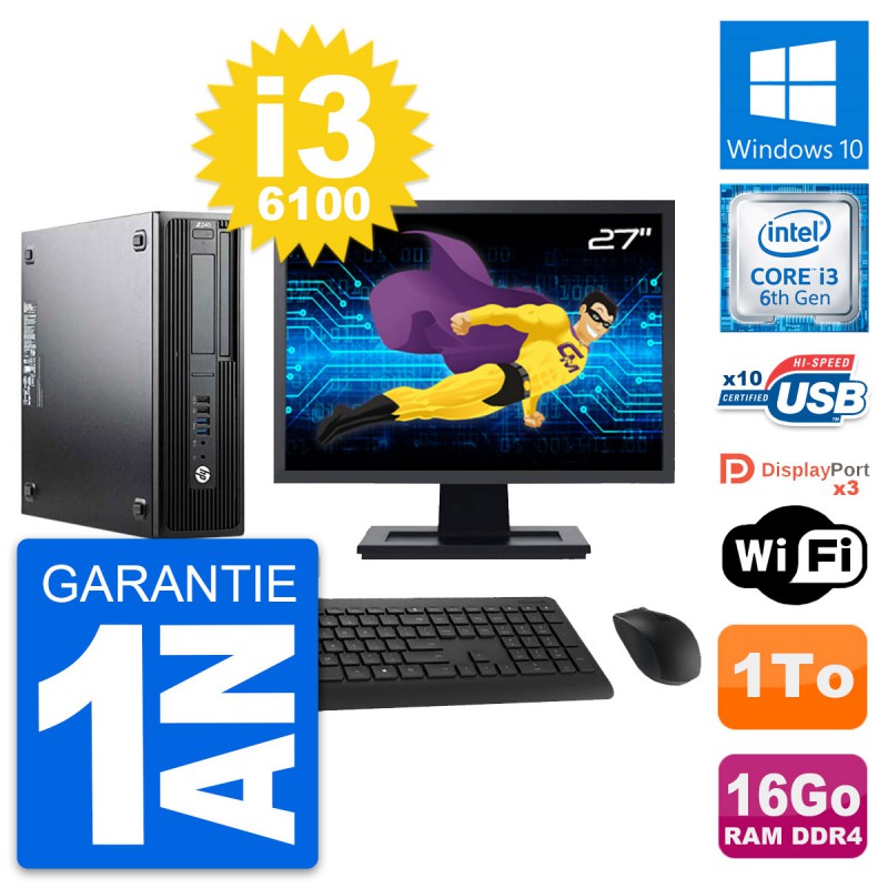PC HP WorkStation Z240 SFF - Intel Core i3-6100 3.7 Ghz (3 Mo) - 16 Go DDR4 - Disque Dur 3,5" 1 To - Clef Wifi USB - Windows 10 - Livré avec Ecran 27" + clavier + souris (Marques et modèles variables) - Garantie 1 an.