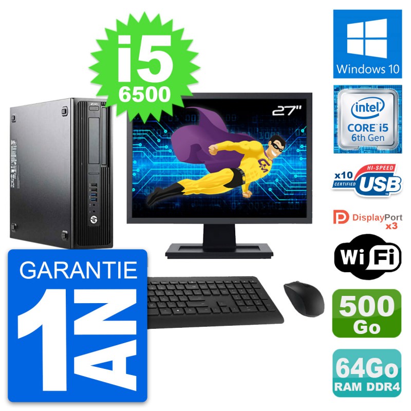 PC HP WorkStation Z240 SFF - Intel Core i5-6500 3.2 Ghz (6 Mo) - 64 Go DDR4 - Disque Dur 3,5" 500 Go - Clef Wifi USB - Windows 10 - Livré avec Ecran 27" + clavier + souris (Marques et modèles variables) - Garantie 1 an.