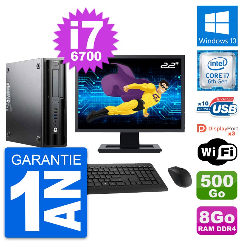 PC HP WorkStation Z240 SFF - Intel Core i7-6700 3.4 Ghz (8 Mo) - 8 Go DDR4 - Disque Dur 3,5" 500 Go - Clef Wifi USB - Windows 10 - Livré avec Ecran 22" + clavier + souris (Marques et modèles variables) - Garantie 1 an.