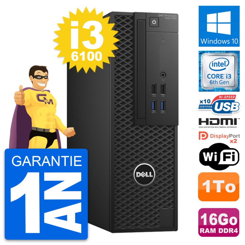 PC Dell Precision T3420 SFF - Intel Core i3-6100 3.7 Ghz (3 Mo) - 16 Go DDR4 - Disque Dur 3,5" 1 To - Clef Wifi USB - Windows 10 - Garantie 1 an.