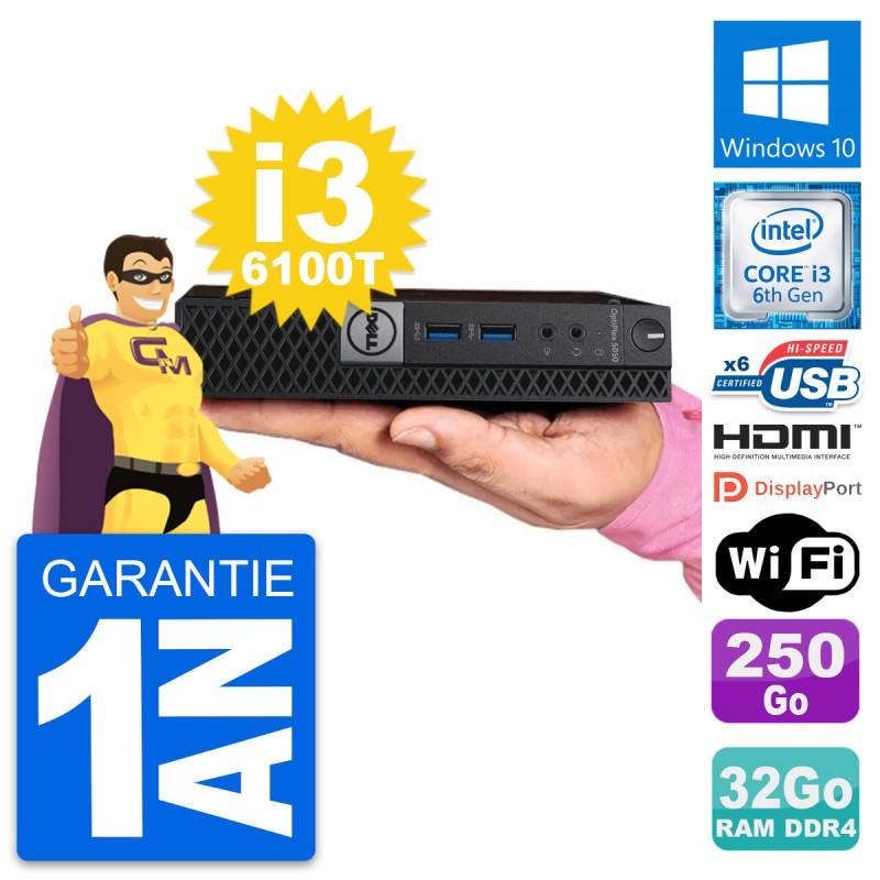 Mini PC Dell OptiPlex 5050 Micro - Intel Core i3-6100T 3.2 Ghz (3 Mo) - 32 Go DDR4 - Disque Dur 2,5" 250 Go - Clef Wifi USB - Windows 10 - Garantie 1 an.