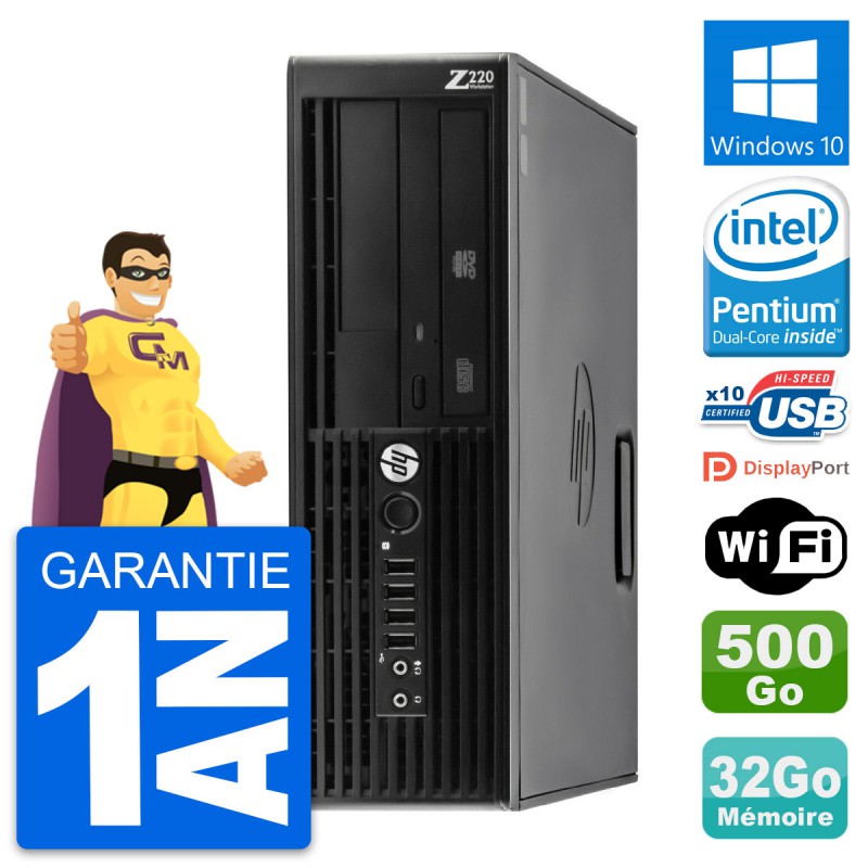 PC HP WorkStation Z220 SFF - Intel Pentium Dual-Core G2020 2.9 Ghz (3 Mo) - 32 Go DDR3 - Disque Dur 3,5" 500 Go - Graveur DVD - Clef Wifi USB - Windows 10 - Garantie 1 an.