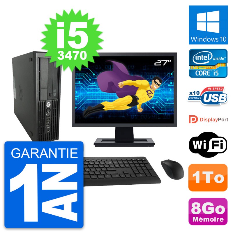 PC HP WorkStation Z220 SFF - Intel Core i5-3470 3.2 Ghz (6 Mo) - 8 Go DDR3 - Disque Dur 3,5" 1 To - Graveur DVD - Clef Wifi USB - Windows 10 - Livré avec Ecran 27" + clavier + souris (Marques et modèles variables) - Garantie 1 an.