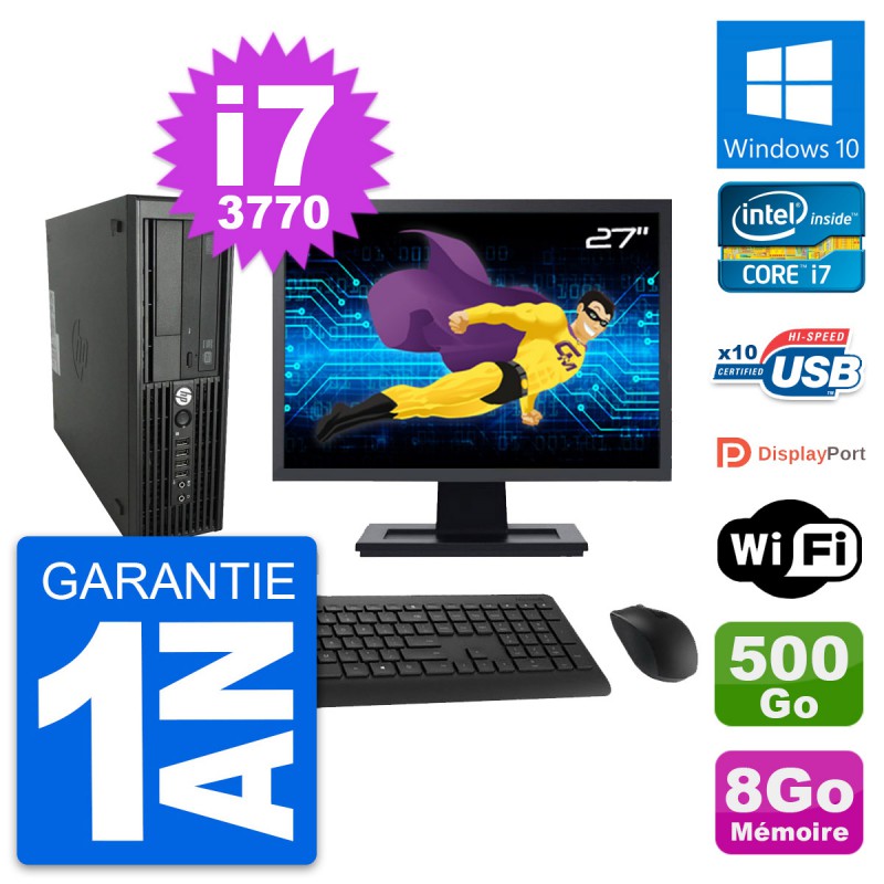 PC HP WorkStation Z220 SFF - Intel Core i7-3770 3.4 Ghz (8 Mo) - 8 Go DDR3 - Disque Dur 3,5" 500 Go - Graveur DVD - Clef Wifi USB - Windows 10 - Livré avec Ecran 27" + clavier + souris (Marques et modèles variables) - Garantie 1 an.