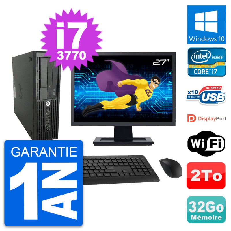 PC HP WorkStation Z220 SFF - Intel Core i7-3770 3.4 Ghz (8 Mo) - 32 Go DDR3 - Disque Dur 3,5" 2 To - Graveur DVD - Clef Wifi USB - Windows 10 - Livré avec Ecran 27" + clavier + souris (Marques et modèles variables) - Garantie 1 an.