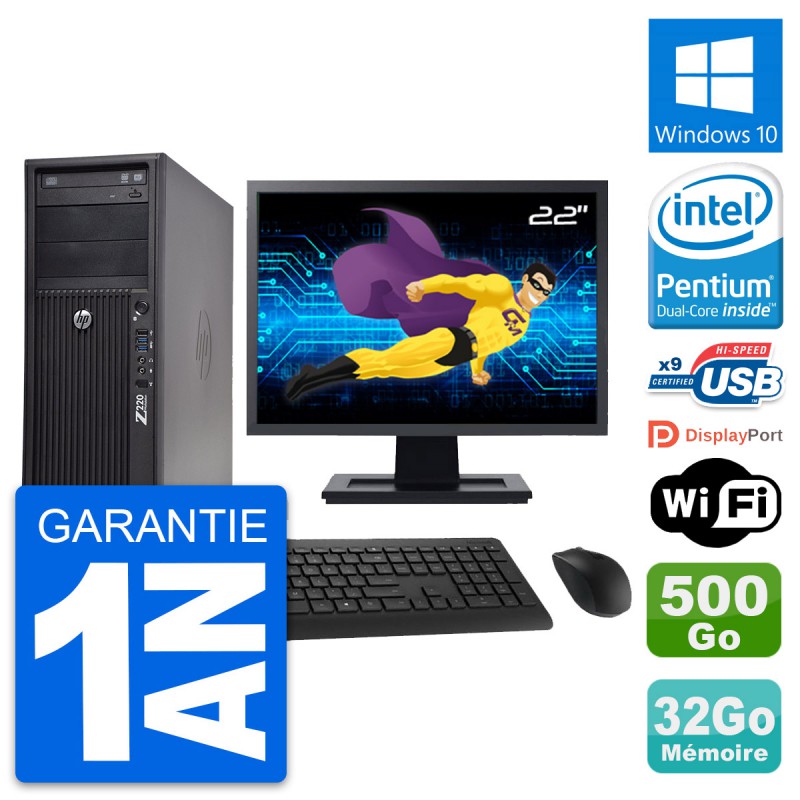 PC Tour HP WorkStation Z220 MT - Intel Pentium Dual-Core G2020 2.9 Ghz (3 Mo) - 32 Go DDR3 - Disque Dur 3,5" 500 Go - Graveur DVD - Clef Wifi USB - Windows 10 - Livré avec Ecran 22" + clavier + souris (Marques et modèles variables) - Garantie 1 an.