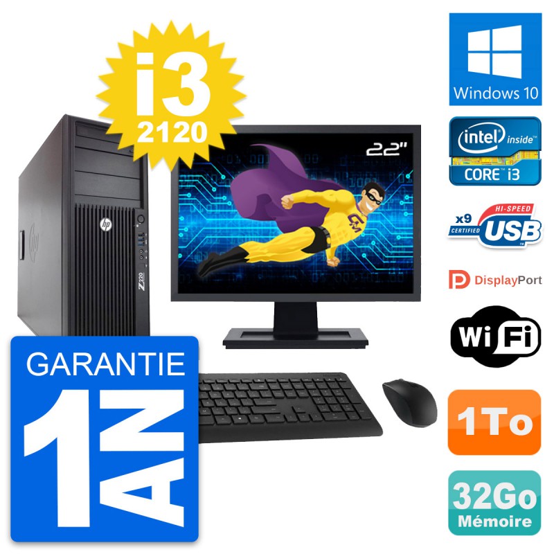 PC Tour HP Z220 Ecran 22" Intel Core i3-3220 RAM 32Go Disque 1To Windows 10 Wifi