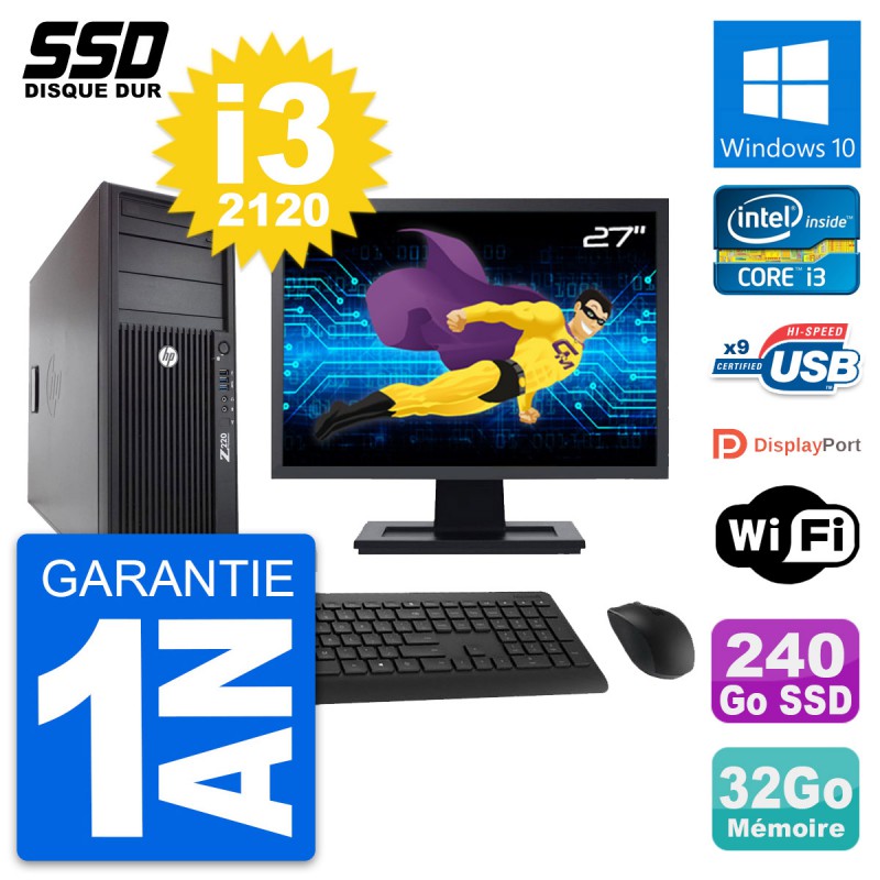 PC Tour HP WorkStation Z220 Ecran 27" i3-3220 RAM 32Go SSD 240Go Windows 10 Wifi