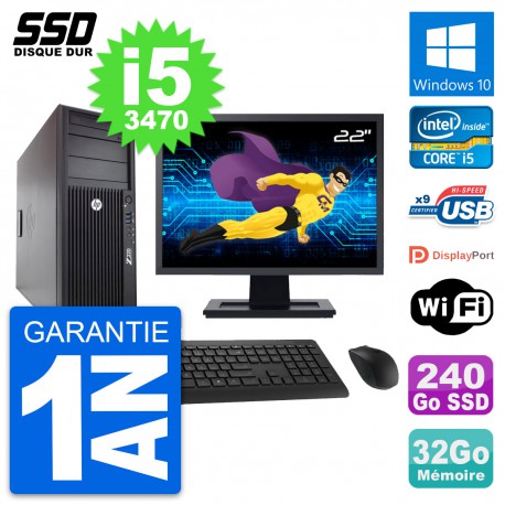 PC Tour HP WorkStation Z220 MT - Intel Core i5-3470 3.2 Ghz (6 Mo) - 32 Go DDR3 - Disque Dur SSD 240 Go - Graveur DVD - Clef Wifi USB - Windows 10 - Livré avec Ecran 22" + clavier + souris (Marques et modèles variables) - Garantie 1 an.