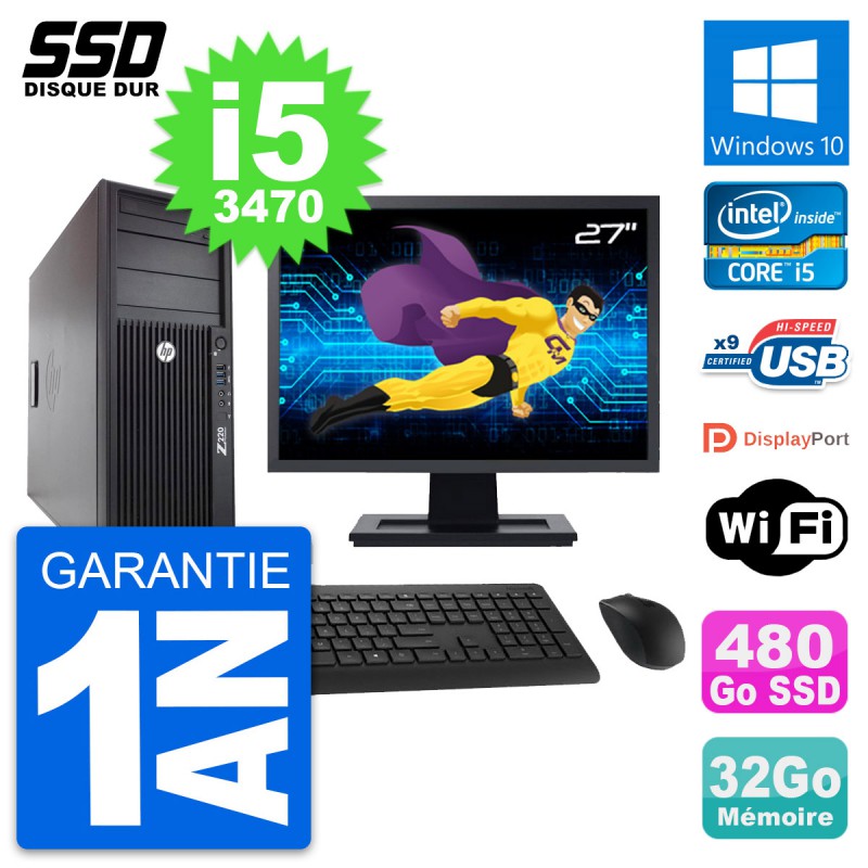 PC Tour HP WorkStation Z220 Ecran 27" i5-3470 RAM 32Go SSD 480Go Windows 10 Wifi