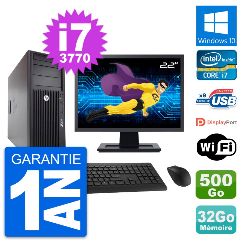PC Tour HP WorkStation Z220 MT - Intel Core i7-3770 3.4 Ghz (8 Mo) - 32 Go DDR3 - Disque Dur 3,5" 500 Go - Graveur DVD - Clef Wifi USB - Windows 10 - Livré avec Ecran 22" + clavier + souris (Marques et modèles variables) - Garantie 1 an.