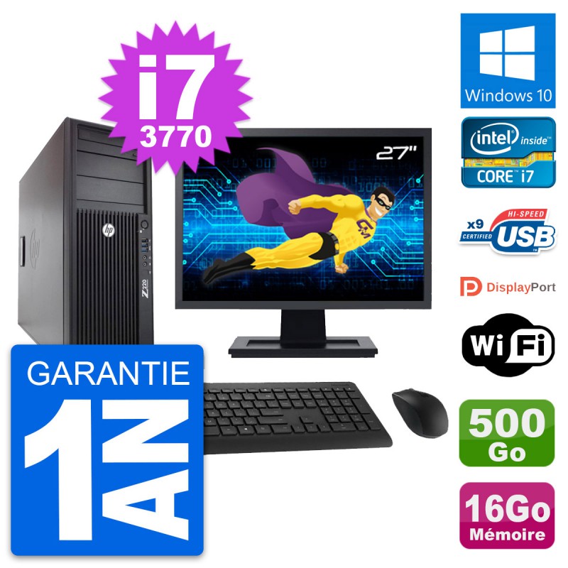 PC Tour HP WorkStation Z220 MT - Intel Core i7-3770 3.4 Ghz (8 Mo) - 16 Go DDR3 - Disque Dur 3,5" 500 Go - Graveur DVD - Clef Wifi USB - Windows 10 - Livré avec Ecran 27" + clavier + souris (Marques et modèles variables) - Garantie 1 an.