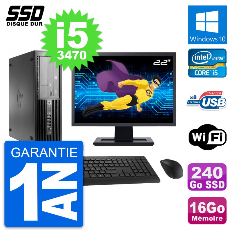 PC HP Compaq Pro 4300 SFF - Intel Core i5-3470 3.2 Ghz (6 Mo) - 16 Go DDR3 - Disque Dur SSD 240 Go - Graveur DVD - Clef Wifi USB - Windows 10 - Livré avec Ecran 22" + clavier + souris (Marques et modèles variables) - Garantie 1 an.