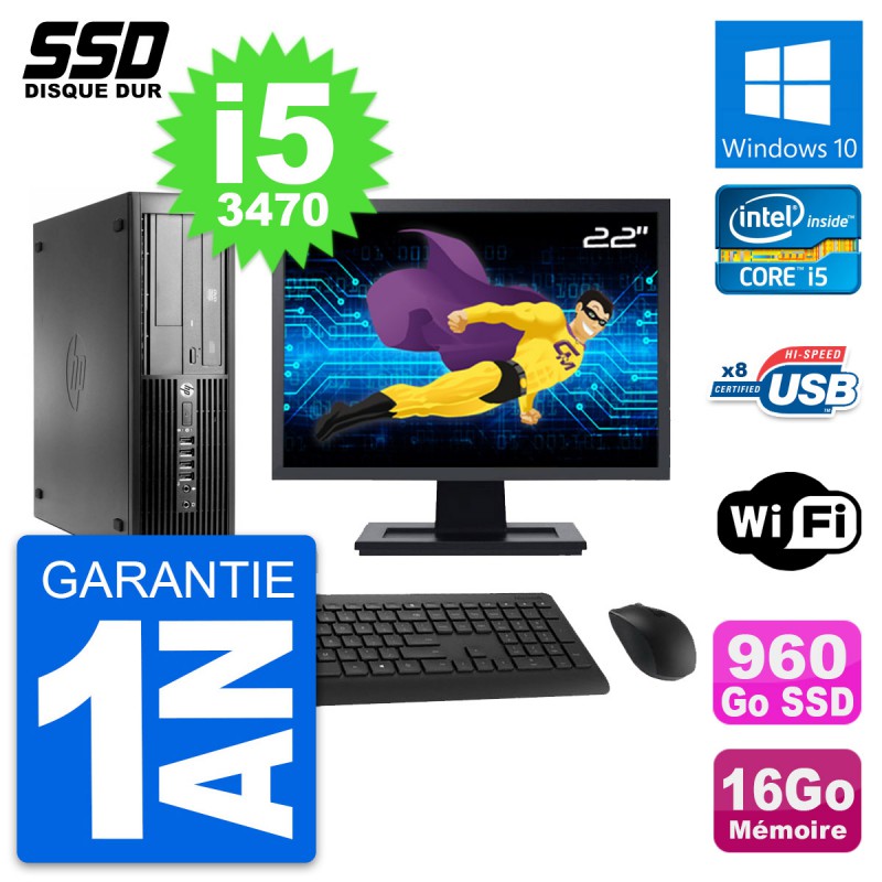 PC HP Compaq Pro 4300 SFF - Intel Core i5-3470 3.2 Ghz (6 Mo) - 16 Go DDR3 - Disque Dur SSD 960 Go - Graveur DVD - Clef Wifi USB - Windows 10 - Livré avec Ecran 22" + clavier + souris (Marques et modèles variables) - Garantie 1 an.