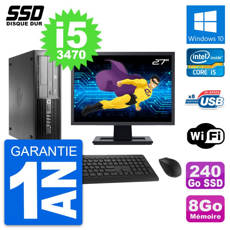 PC HP Compaq Pro 4300 SFF - Intel Core i5-3470 3.2 Ghz (6 Mo) - 8 Go DDR3 - Disque Dur SSD 240 Go - Graveur DVD - Clef Wifi USB - Windows 10 - Livré avec Ecran 27" + clavier + souris (Marques et modèles variables) - Garantie 1 an.