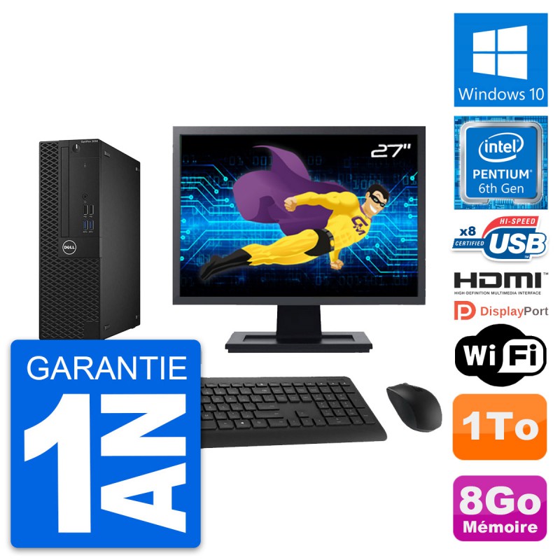 PC Dell OptiPlex 3050 SFF - Intel Pentium Dual-Core G4400 3.3 Ghz (3 Mo) - 8 Go DDR4 - Disque Dur 3,5" 1 To - Clef Wifi USB - Windows 10 - Livré avec Ecran 27" + clavier + souris (Marques et modèles variables) - Garantie 1 an.