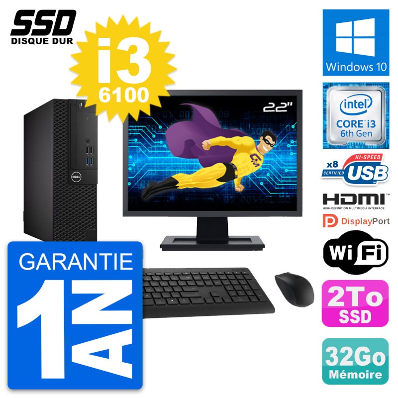 PC Dell OptiPlex 3050 SFF - Intel Core i3-6100 3.7 Ghz (3 Mo) - 32 Go DDR4 - SSD 2 To - Clef Wifi USB - Windows 10 - Livré avec Ecran 22" + clavier + souris (Marques et modèles variables) - Garantie 1 an.