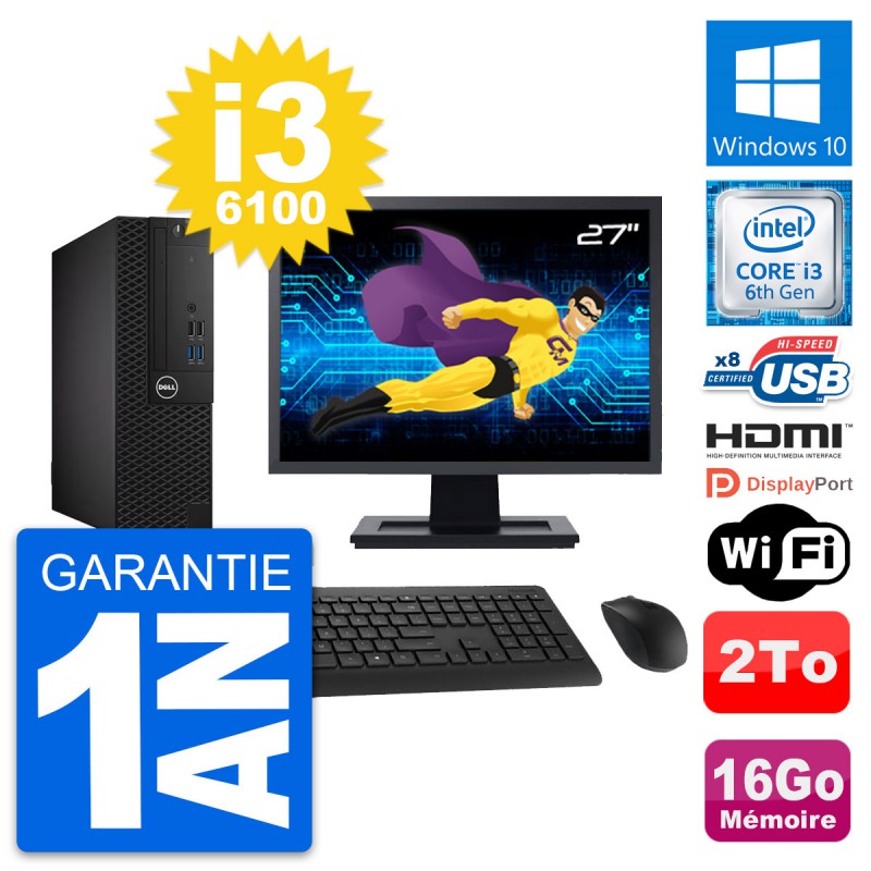 PC Dell OptiPlex 3050 SFF - Intel Core i3-6100 3.7 Ghz (3 Mo) - 16 Go DDR4 - Disque Dur 3,5" 2 To - Clef Wifi USB - Windows 10 - Livré avec Ecran 27" + clavier + souris (Marques et modèles variables) - Garantie 1 an.