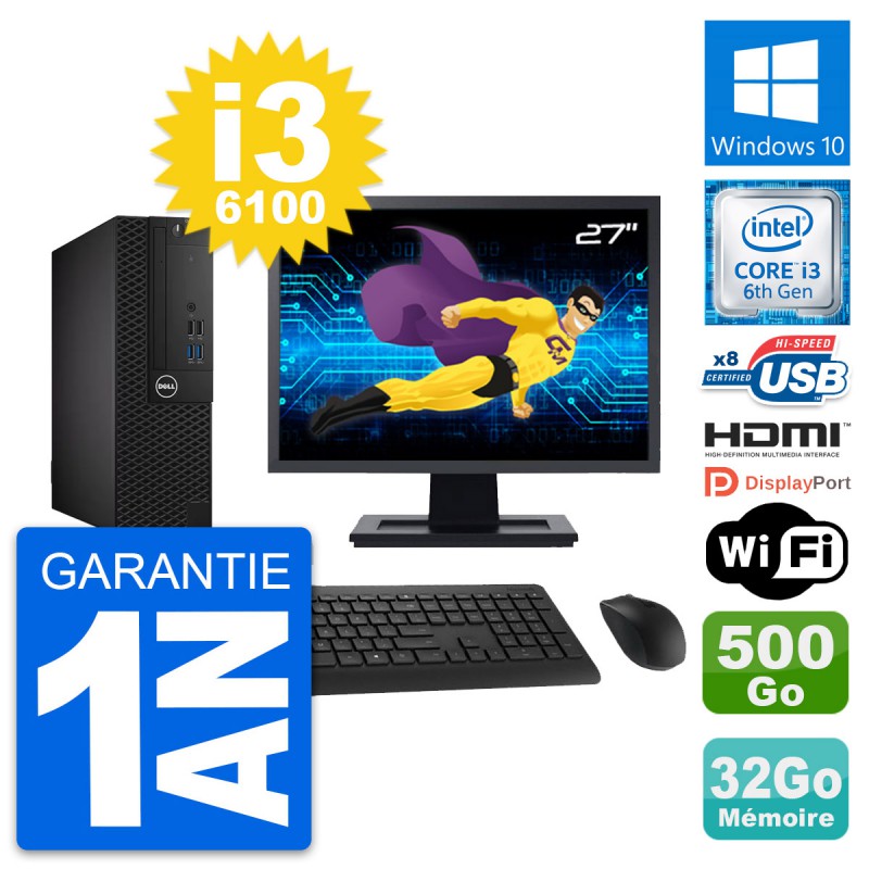 PC Dell OptiPlex 3050 SFF - Intel Core i3-6100 3.7 Ghz (3 Mo) - 32 Go DDR4 - Disque Dur 3,5" 500 Go - Clef Wifi USB - Windows 10 - Livré avec Ecran 27" + clavier + souris (Marques et modèles variables) - Garantie 1 an.