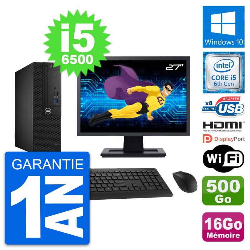 PC Dell OptiPlex 3050 SFF - Intel Core i5-6500 3.2 Ghz (6 Mo) - 16 Go DDR4 - Disque Dur 3,5" 500 Go - Clef Wifi USB - Windows 10 - Livré avec Ecran 27" + clavier + souris (Marques et modèles variables) - Garantie 1 an.