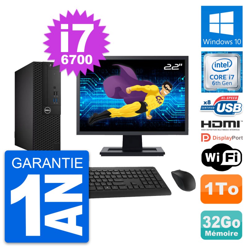 PC Dell OptiPlex 3050 SFF - Intel Core i7-6700 3.4 Ghz (8 Mo) - 32 Go DDR4 - Disque Dur 3,5" 1 To - Clef Wifi USB - Windows 10 - Livré avec Ecran 22" + clavier + souris (Marques et modèles variables) - Garantie 1 an.