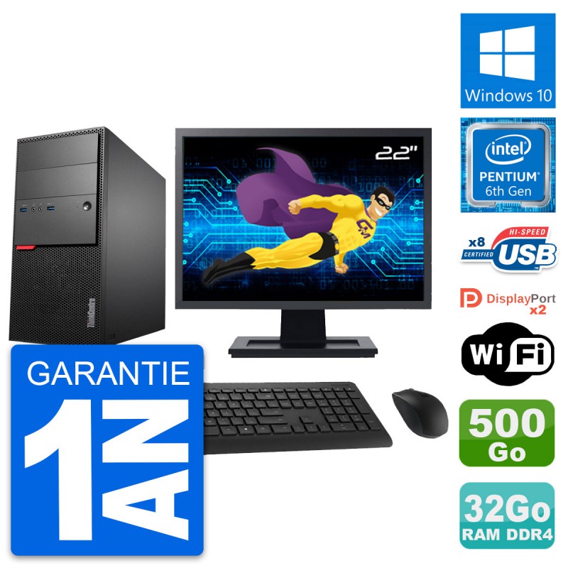 PC Tour Lenovo ThinkCentre M800 - Intel Pentium Dual-Core G4400 3.3 Ghz (3 Mo) - 32 Go DDR4 - Disque Dur 3,5" 500 Go - Clef Wifi USB - Windows 10 - Livré avec Ecran 22" + clavier + souris (Marques et modèles variables) - Garantie 1 an.