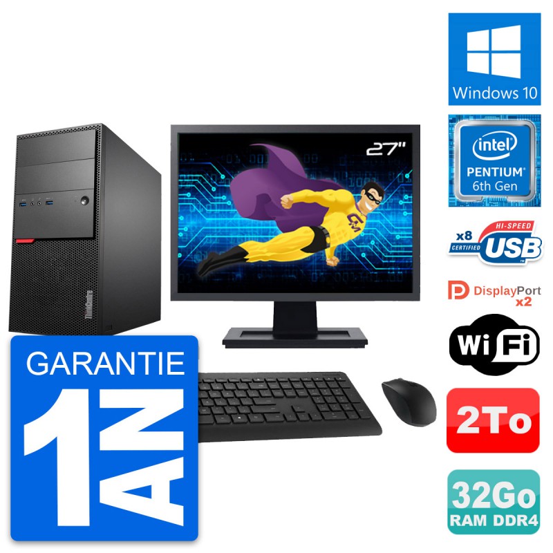 PC Tour Lenovo ThinkCentre M800 - Intel Pentium Dual-Core G4400 3.3 Ghz (3 Mo) - 32 Go DDR4 - Disque Dur 3,5" 2 To - Clef Wifi USB - Windows 10 - Livré avec Ecran 27" + clavier + souris (Marques et modèles variables) - Garantie 1 an.