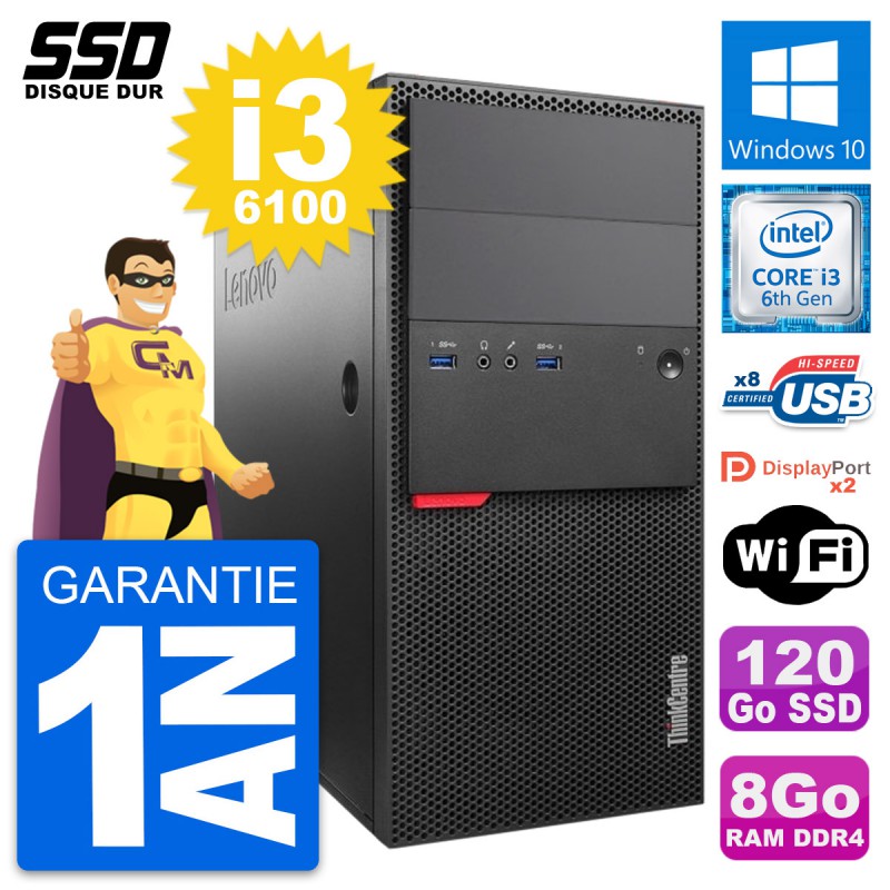 PC Tour Lenovo ThinkCentre M800 - Intel Core i3-6100 3.7 Ghz (3 Mo) - 8 Go DDR4 - SSD 120 Go - Clef Wifi USB - Windows 10 - Garantie 1 an.