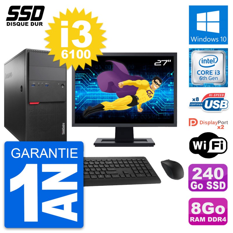 PC Tour Lenovo ThinkCentre M800 - Intel Core i3-6100 3.7 Ghz (3 Mo) - 8 Go DDR4 - SSD 240 Go - Clef Wifi USB - Windows 10 - Livré avec Ecran 27" + clavier + souris (Marques et modèles variables) - Garantie 1 an.