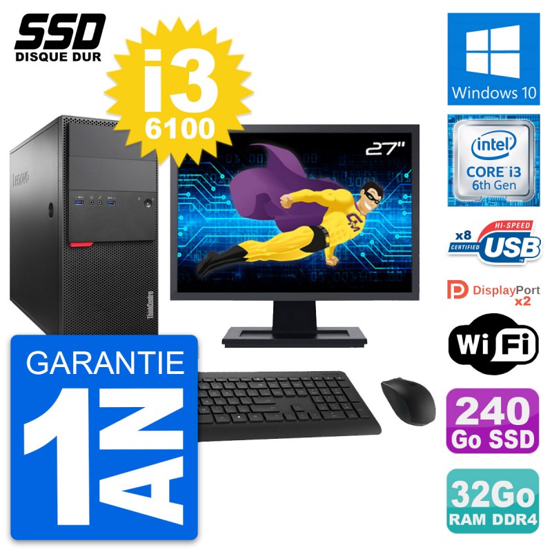 PC Tour Lenovo ThinkCentre M800 - Intel Core i3-6100 3.7 Ghz (3 Mo) - 32 Go DDR4 - SSD 240 Go - Clef Wifi USB - Windows 10 - Livré avec Ecran 27" + clavier + souris (Marques et modèles variables) - Garantie 1 an.