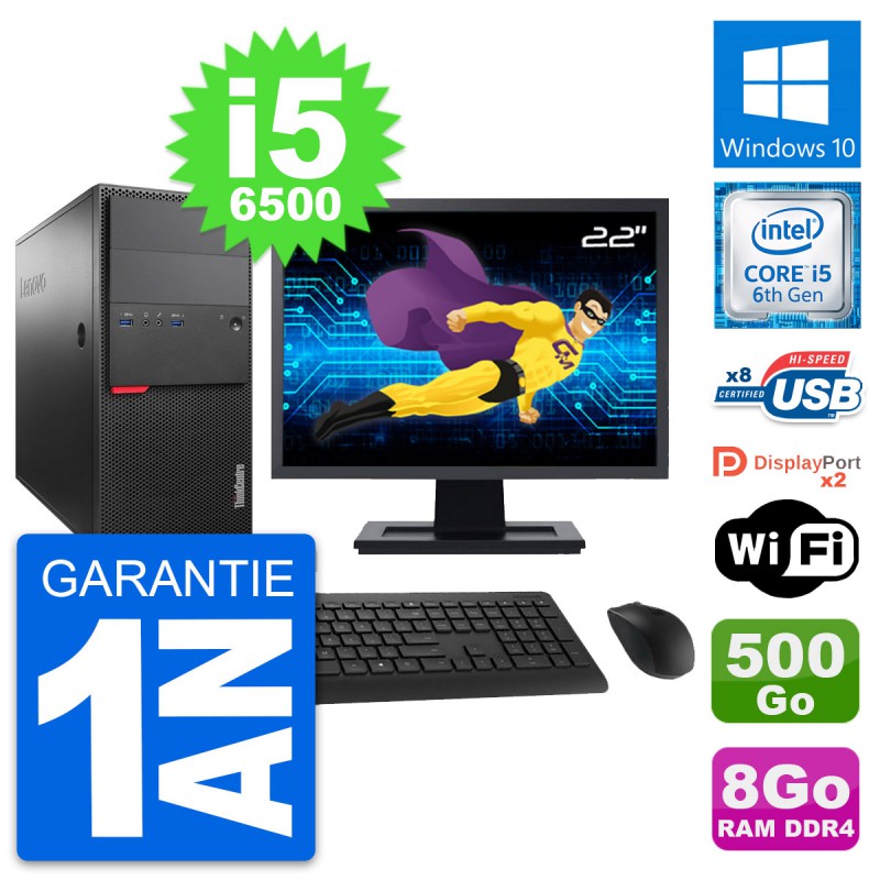 PC Tour Lenovo ThinkCentre M800 - Intel Core i5-6500 3.2 Ghz (6 Mo) - 8 Go DDR4 - Disque Dur 3,5" 500 Go - Clef Wifi USB - Windows 10 - Livré avec Ecran 22" + clavier + souris (Marques et modèles variables) - Garantie 1 an.