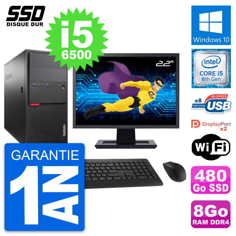PC Tour Lenovo ThinkCentre M800 - Intel Core i5-6500 3.2 Ghz (6 Mo) - 8 Go DDR4 - SSD 480 Go - Clef Wifi USB - Windows 10 - Livré avec Ecran 22" + clavier + souris (Marques et modèles variables) - Garantie 1 an.