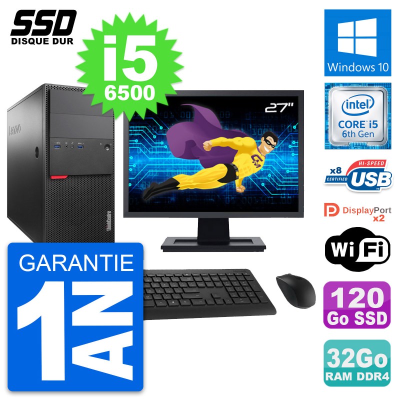 PC Tour Lenovo ThinkCentre M800 - Intel Core i5-6500 3.2 Ghz (6 Mo) - 32 Go DDR4 - SSD 120 Go - Clef Wifi USB - Windows 10 - Livré avec Ecran 27" + clavier + souris (Marques et modèles variables) - Garantie 1 an.