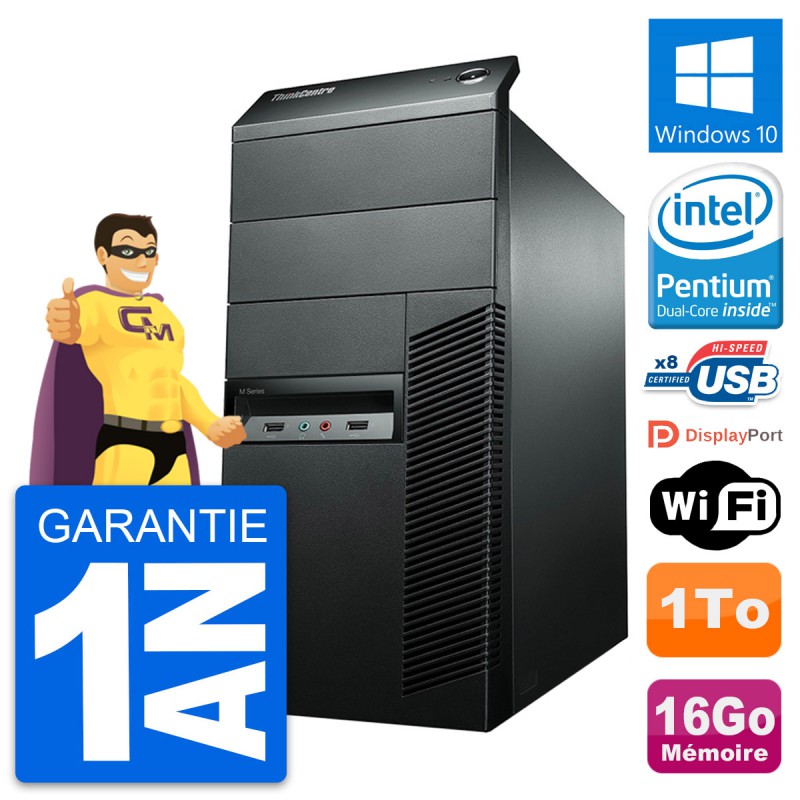 PC Tour Lenovo ThinkCentre M92p MT - Intel Pentium Dual-Core G2020 2.9 Ghz (3 Mo) - 16 Go DDR3 - Disque Dur 3,5" 1 To - Clef Wifi USB - Windows 10 - Garantie 1 an.