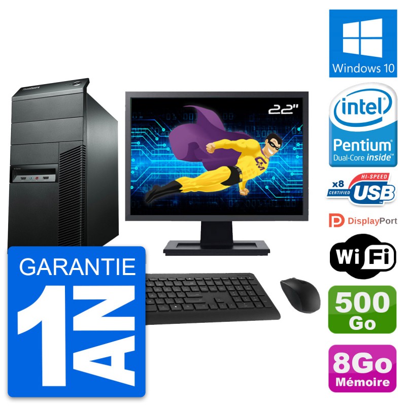 PC Tour Lenovo ThinkCentre M92p MT - Intel Pentium Dual-Core G2020 2.9 Ghz (3 Mo) - 8 Go DDR3 - Disque Dur 3,5" 500 Go - Clef Wifi USB - Windows 10 - Livré avec Ecran 22" + clavier + souris (Marques et modèles variables) - Garantie 1 an.