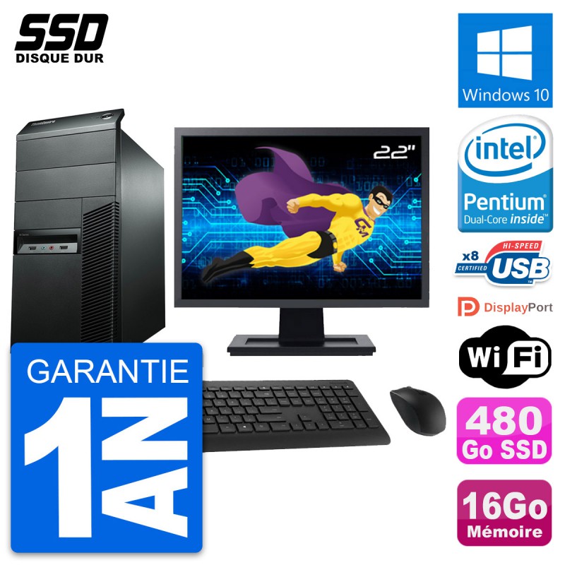 PC Tour Lenovo ThinkCentre M92p MT - Intel Pentium Dual-Core G2020 2.9 Ghz (3 Mo) - 16 Go DDR3 - Disque Dur SSD 480 Go - Clef Wifi USB - Windows 10 - Livré avec Ecran 22" + clavier + souris (Marques et modèles variables) - Garantie 1 an.