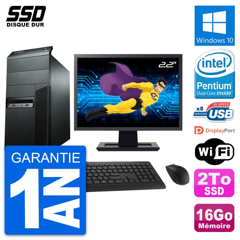 PC Tour Lenovo ThinkCentre M92p MT - Intel Pentium Dual-Core G2020 2.9 Ghz (3 Mo) - 16 Go DDR3 - Disque Dur SSD 2 To - Clef Wifi USB - Windows 10 - Livré avec Ecran 22" + clavier + souris (Marques et modèles variables) - Garantie 1 an.