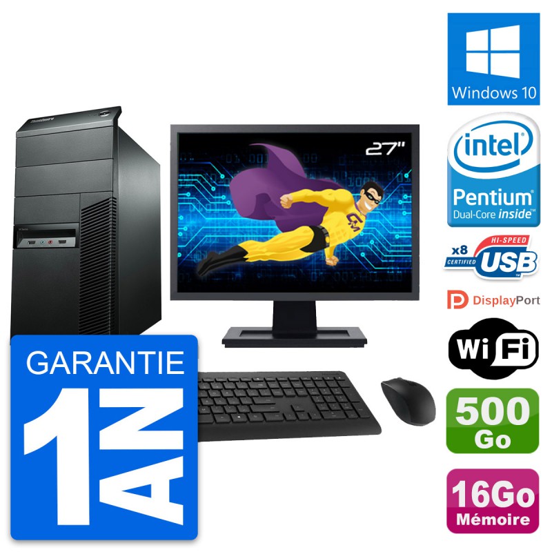 PC Tour Lenovo ThinkCentre M92p MT - Intel Pentium Dual-Core G2020 2.9 Ghz (3 Mo) - 16 Go DDR3 - Disque Dur 3,5" 500 Go - Clef Wifi USB - Windows 10 - Livré avec Ecran 27" + clavier + souris (Marques et modèles variables) - Garantie 1 an.