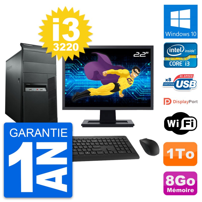 PC Tour Lenovo M92p Ecran 22" Intel i3-3220 RAM 8Go Disque 1To Windows 10 Wifi
